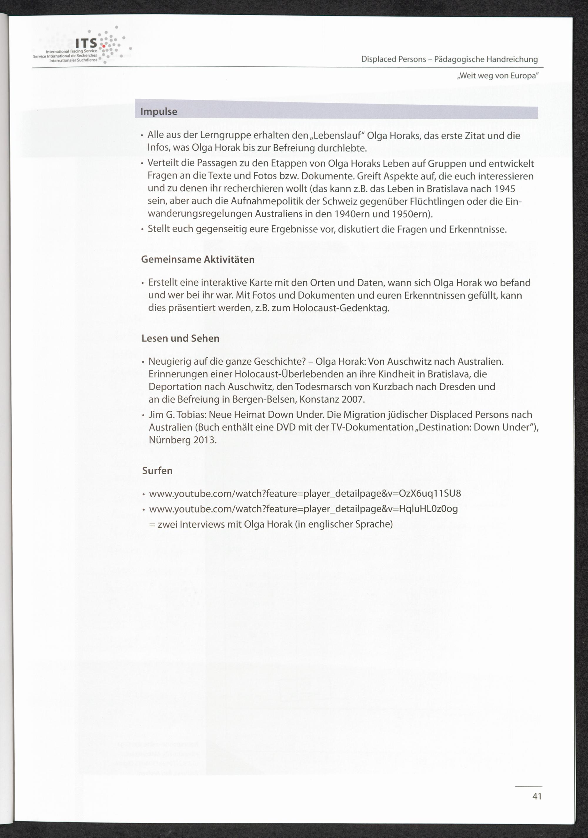 Pädagogische Handreichungen - Displaced Persons Heft 4. "Weit weg von Europa" oder "Das Leben in Australien war ganz anders" Olga Horak: Bratislava, Auschwitz, Bergen-Belsen - und ein neues Leben in Austra...