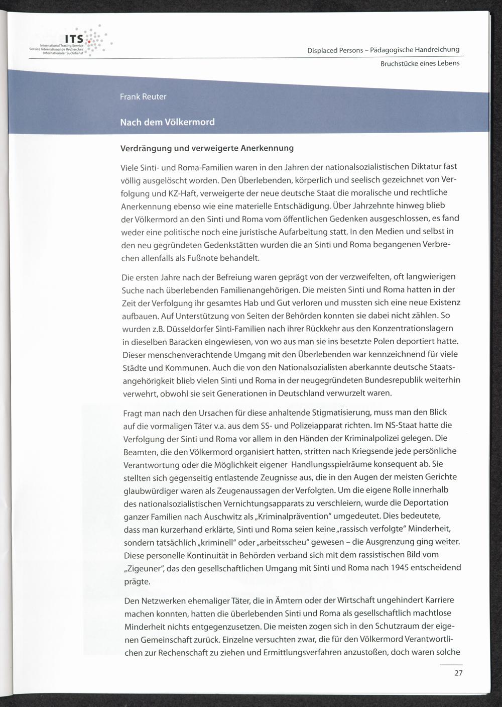 Pädagogische Handreichungen - Displaced Persons Heft 1. Bruchstücke eines Lebens Nach dem Völkermord: Verdrängung und verweigerte Anerkennung