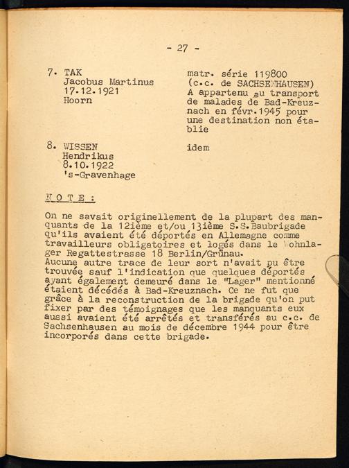 Etude sur les S.S. Baubrigaden Annexe Liste des manquants hollandais par brigade
